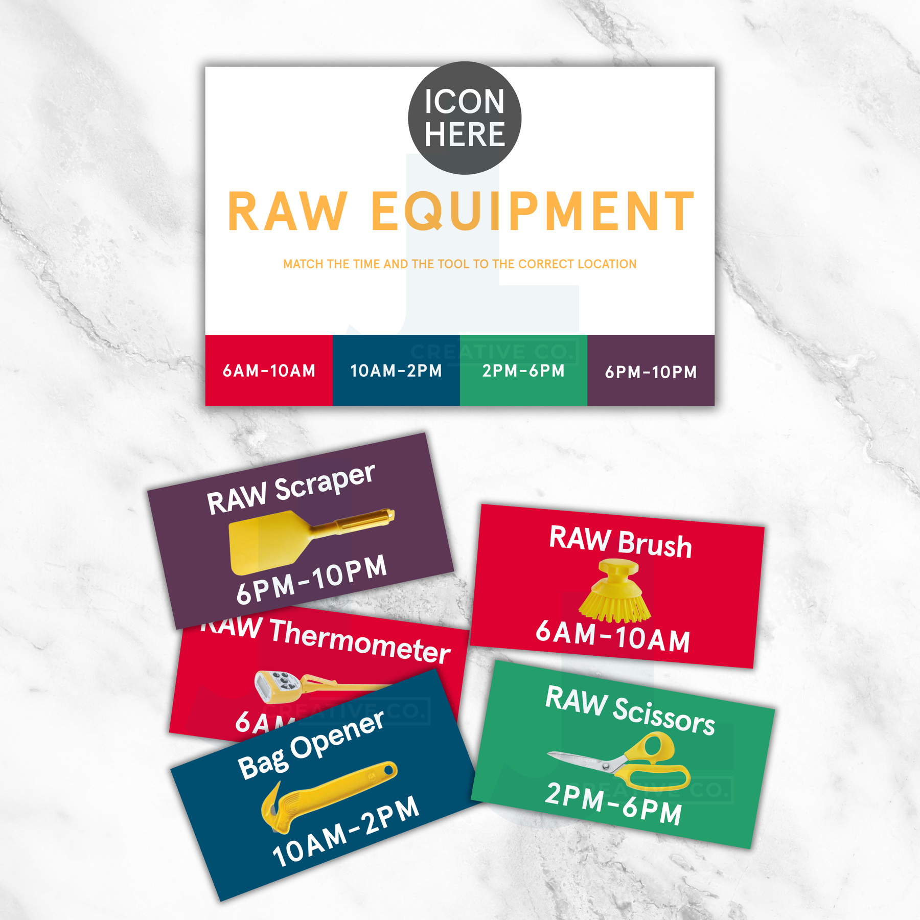 Ensure your team grabs the right tool at the right time with our Raw Equipment Labeling System, designed to simplify daypart-based tool rotation using bold colors, clear icons, and labeled time ranges.