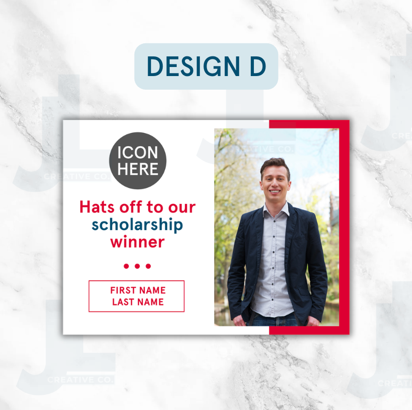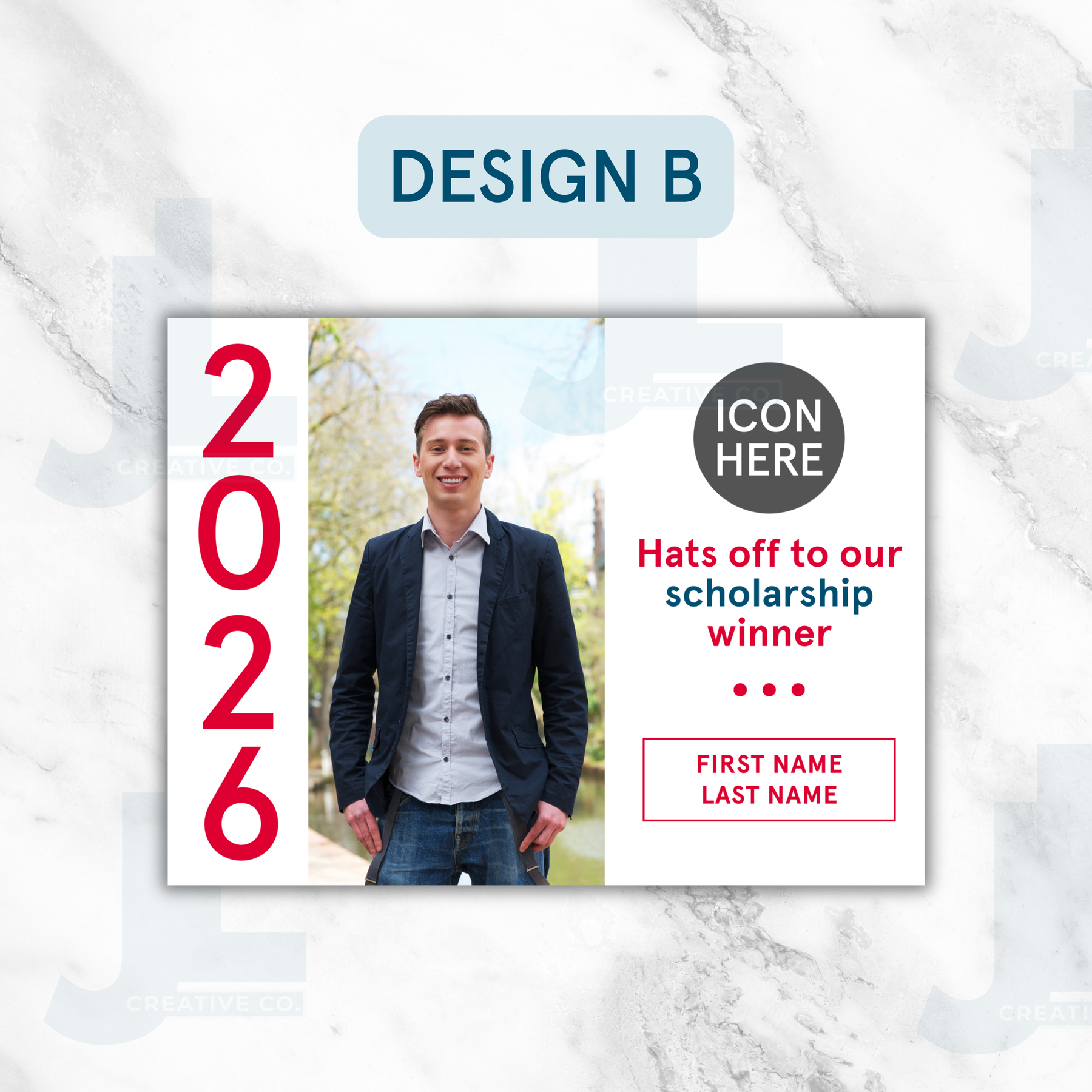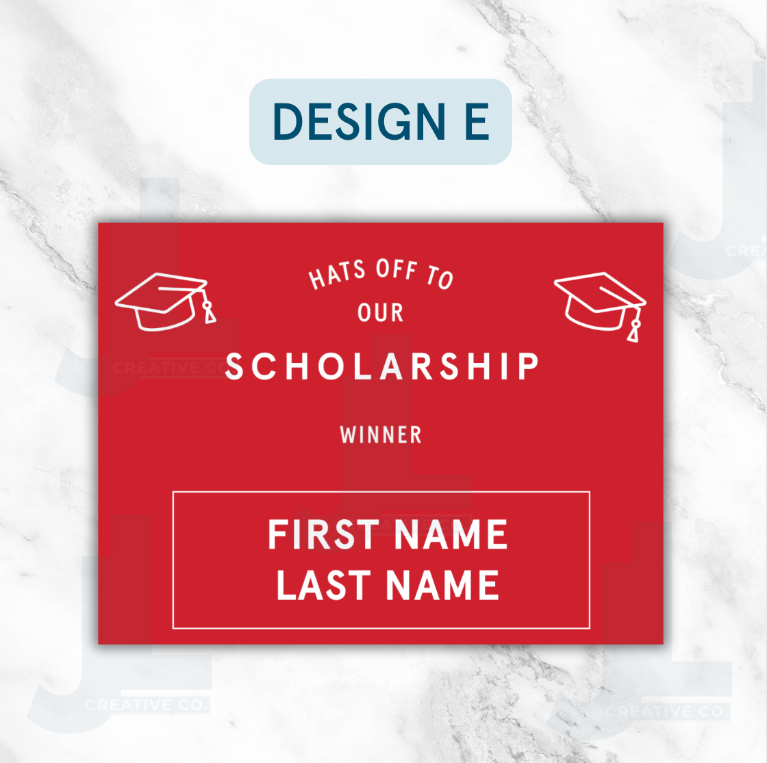 Each sign can be customized with the recipient’s name, award title, scholarship amount (optional), school, and photo (optional), creating a professional and community-centered display.