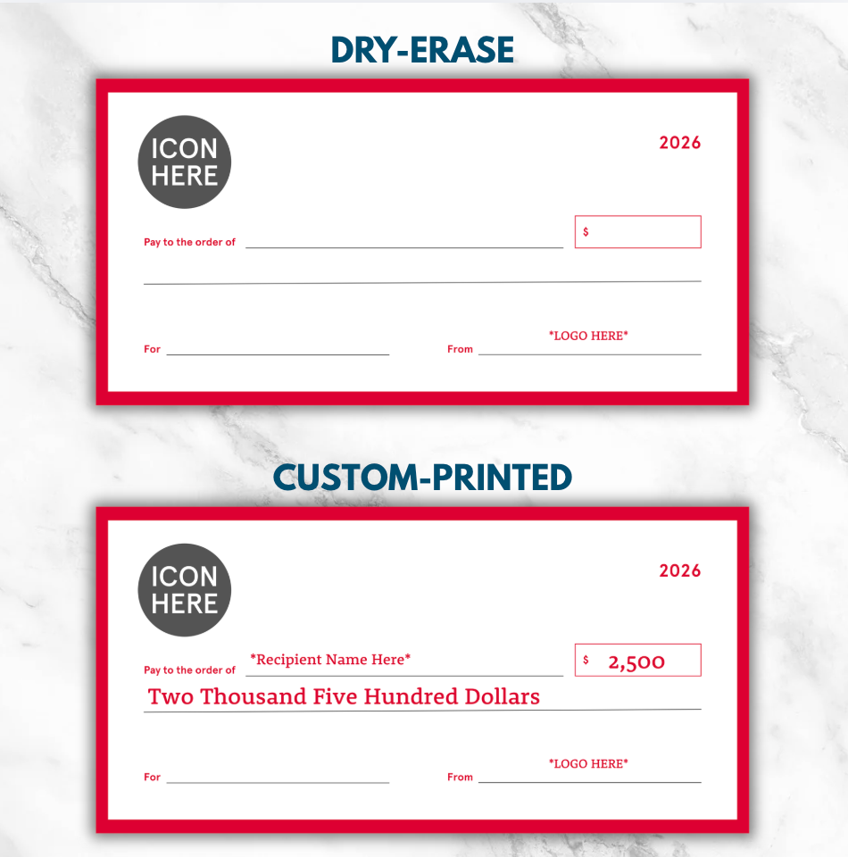 • Custom-Printed Version: Have a specific award in mind? We’ll personalize your check with the name, amount, and recognition message for a polished, permanent presentation piece.